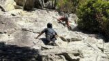 【午前】午前中は、Oさん、Kさん、Hさんは南面(奥壁)で5.8、5.9 2 ピッチで、マルチピッチで登られました。ロングルートなので長時間になるので、夏場では耐えられなかも。
