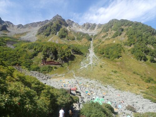 初日は涸沢までの長い道のり。テントと食材の重さがじわじわと肩にのしかかる。