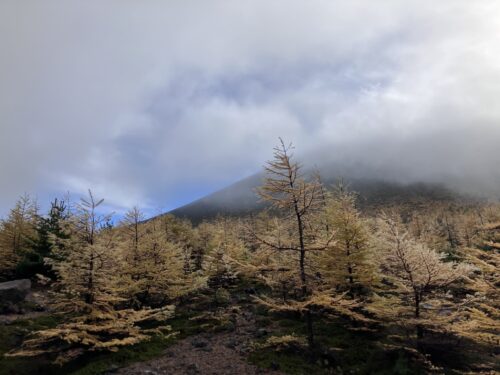 でも、一瞬のガスの切れ間に浅間山と黄金色のカラマツが見えたのはラッキーでした。