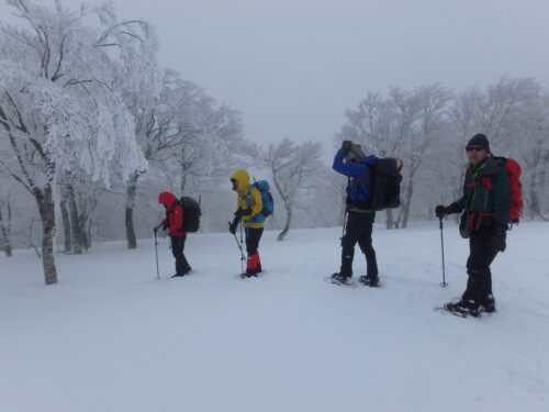 私都川の右岸はオリジナルコースのためトレースは全く無く途中の斜面でワカンを装着し臨みます。見える地形と地図を頼りに目指す方向をみんなでフォローしながら進みます。時には支流の川を渡ったり、急斜面では何度も先頭のラッセルを交代しながら登りますが道のり 5km 足らずの扇ノ山山頂には雪山ではなかなか到着できないことを実感しました。それでも途中の景色や木々の霧氷などを楽しみながらやっと姿を現した避難小屋には感激でした。下山もコースが長く結構手間取り時間がかかってしましました。